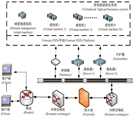 系统逻辑拓扑示意图:      两台高性能服务器通过内网 交换机与存储器并行连接, 物理服务器可灵活扩展增加; 客户端与虚拟系统通过硬件防火墙连接,系统安全性高; 建立的虚拟机运行于VMware ESXi 5.1平台上,可根据需要灵活增减虚拟机数量; 通过vCenter客户端管理虚拟系统,界面友好、操作简单、易于掌握。