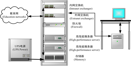 物理结构示意图: 两台高性能服务器通过内网交换机连接到存储器上; 外部网络通过外网交换机与服务器系统相连接; 交换机之间架设硬件防火墙; 系统以内网终端进行管理; 系统通过UPS电源供电。